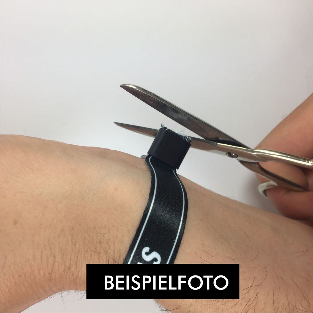 - die Fotos zeigen dir ein Beispiel, wie Stoffbändchen mit Kunststoffplombe am Handgelenk verschlossen werden