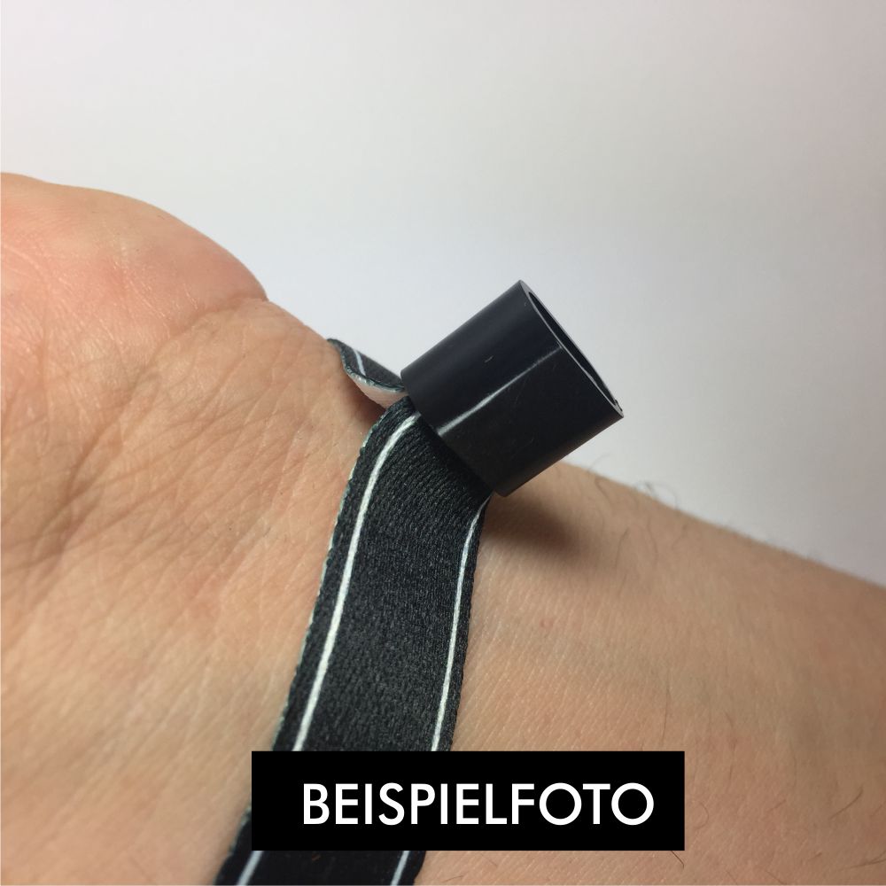 - die Fotos zeigen dir ein Beispiel, wie Stoffbändchen mit Kunststoffplombe am Handgelenk verschlossen werden
