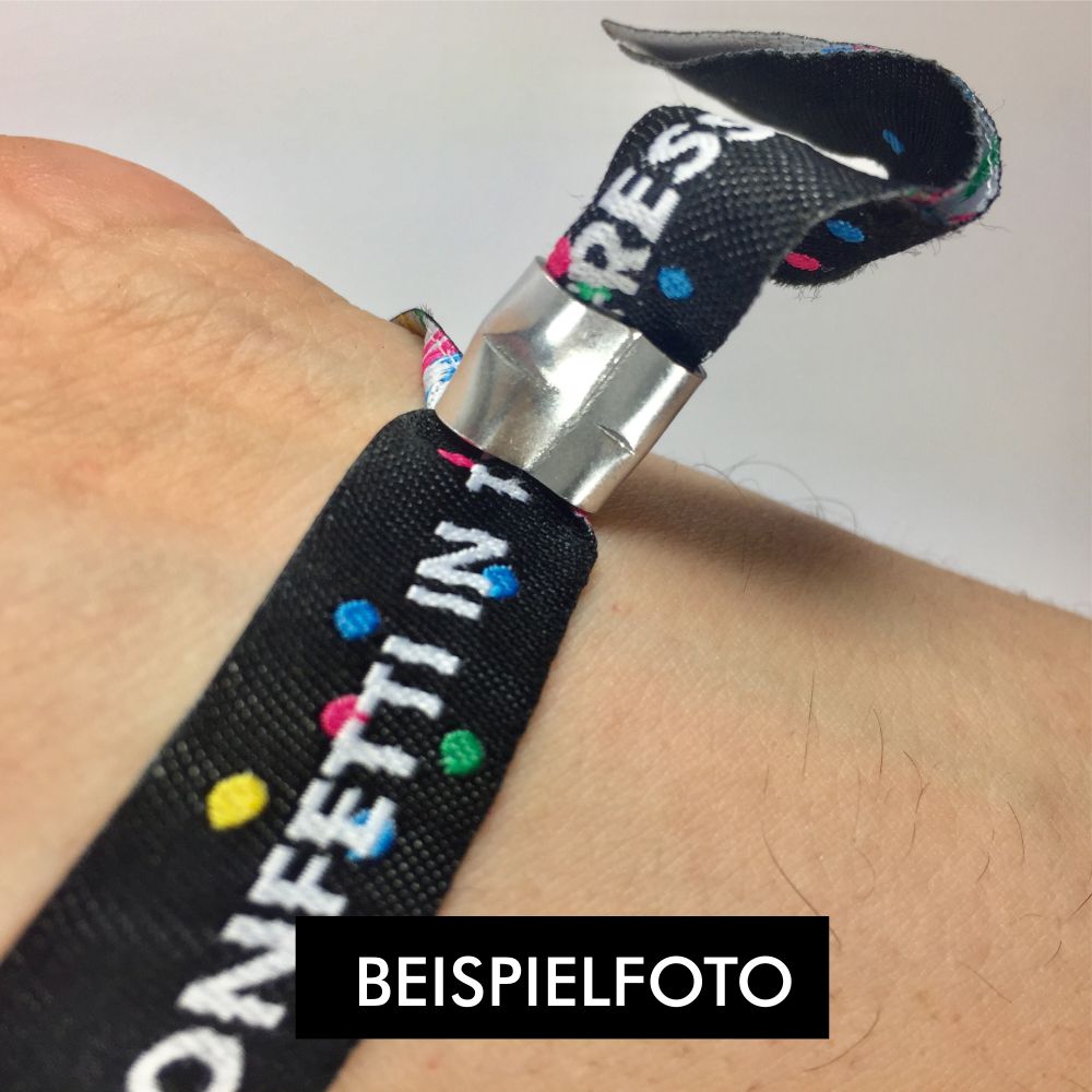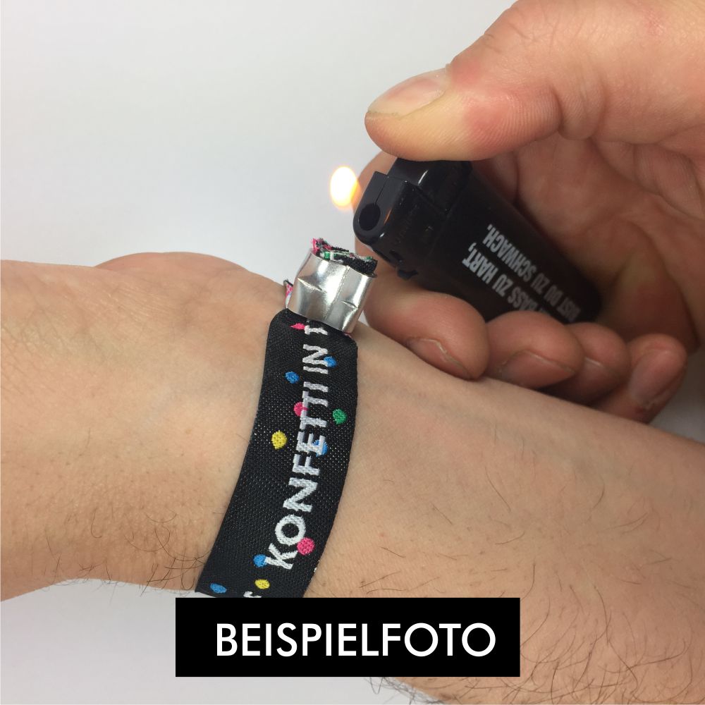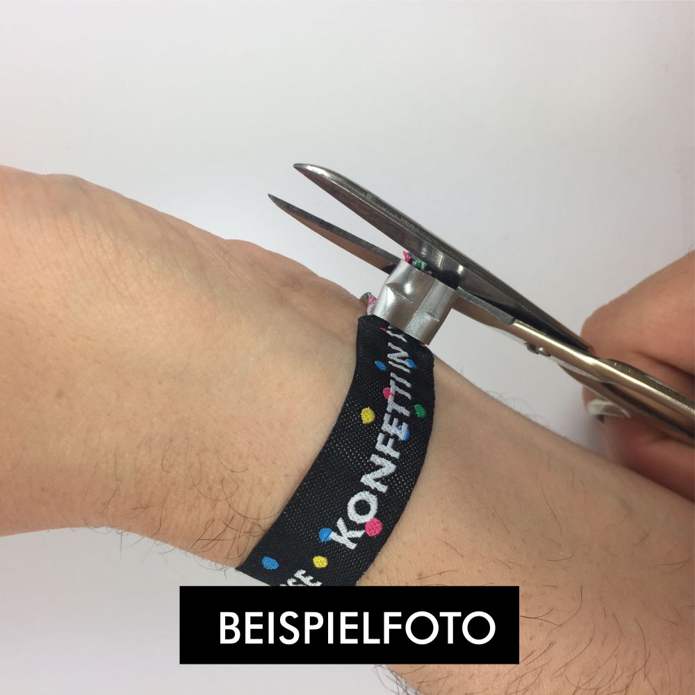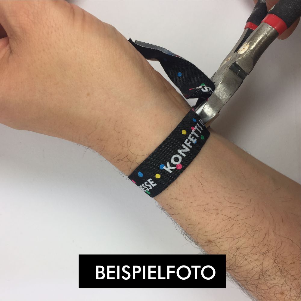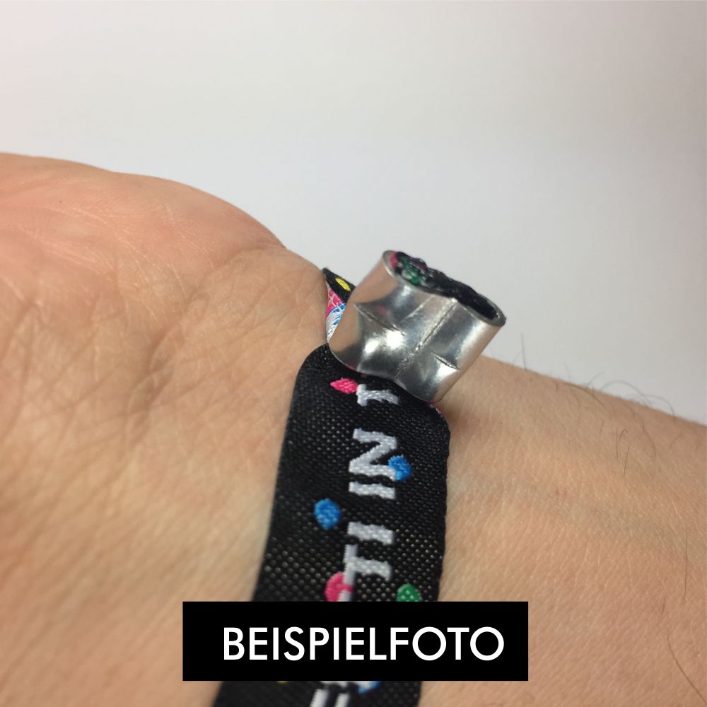 - die Fotos zeigen dir ein Beispiel, wie Stoffbändchen mit Aluplombe am Handgelenk verschlossen werden